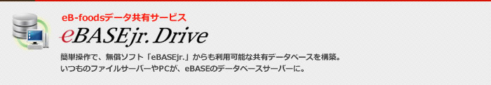 eBASEjr. および eBASEstandard で作成したデータを、社内ネットワーク上で共有可能にする、ポイント定額のサービスです。専用サーバーを必要とせず、eBASEjr.の指定ボリュームを他のeBASEjr.端末で共有ボリュームとして利用することが可能です。