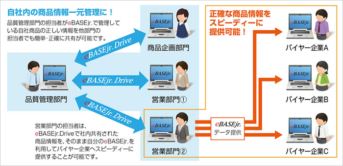簡単設定で、すぐに社内各所のeBASEjr.データベースを共有利用できるので、業務効率向上にお役立ていただけます。